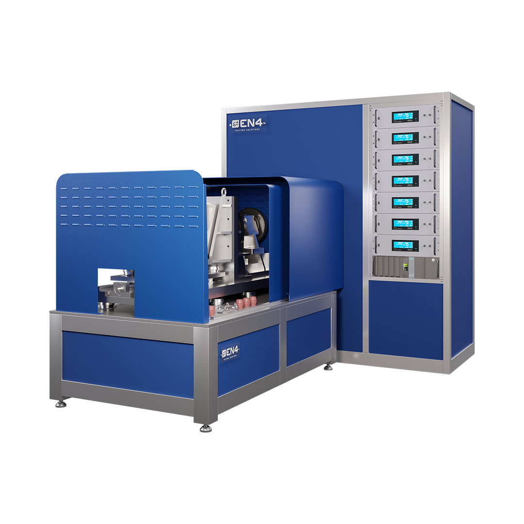The 4EV-T electric motor and e-mobility test bench by EN4 is an advanced system engineered for the functional and performance characterization of electric motors used in e-mobility applications. Designed specifically for the demands of automotive R&D and production environments, it enables comprehensive evaluation in both dynamic and regenerative test cycles, focusing on motor and inverter coupling. At its core, the 4EV-T incorporates a Siemens servomotor as a precision dynamometric brake, interfaced with the device under test (DUT), and managed through a high-efficiency DC/DC converter. The system supports regenerative energy recovery, efficiently transferring energy back to the DC bus during testing. This architecture enhances power management and reduces wastage, ensuring superior energy efficiency throughout the test process. Functional and dynamic cycles can be configured to test motor efficiency, cogging torque analysis, inverter validation, power delivery, battery simulation, and realistic cycle scenarios. Real-time measurements enable rigorous validation of powertrain requirements.