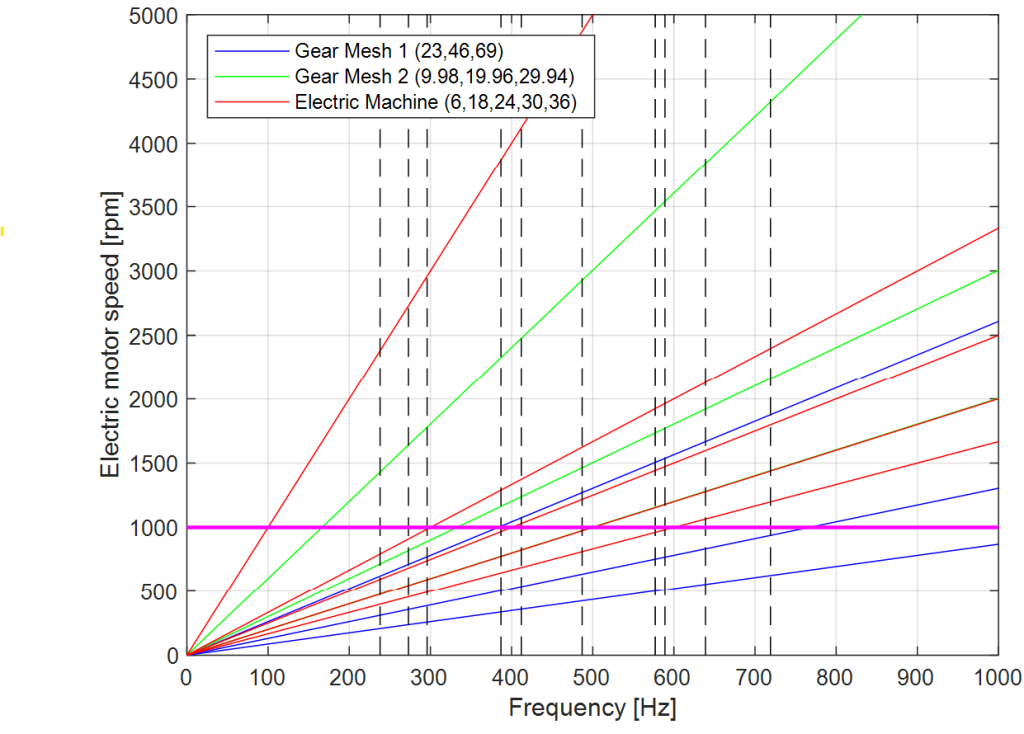 - Plotting of mechanical and electric orders on an extended Campbell diagram, which highlights both the resonances of the system and the speed of electric machine adopted in multi-body simulations.