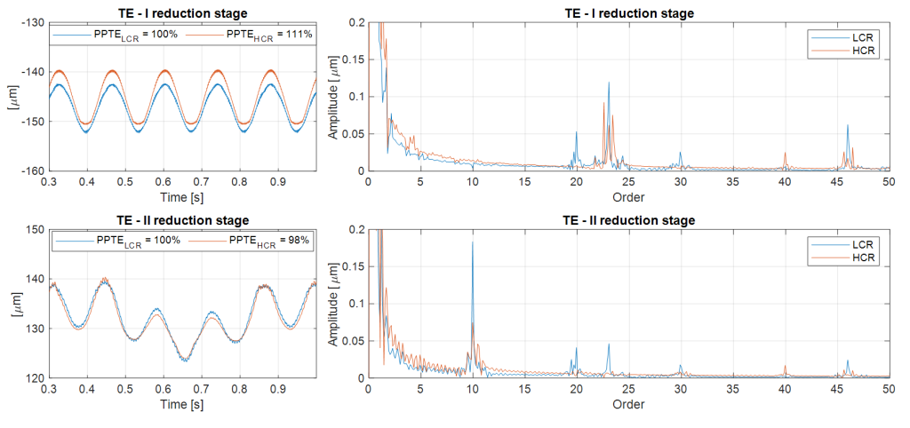 - Transmission error: The time and frequency simulation show a lower amplitude of the meshing order for the HCR gearing, despite the appearance of sidebands due to the modulation of rotation orders induced by the housing stiffness and by bearing clearances.