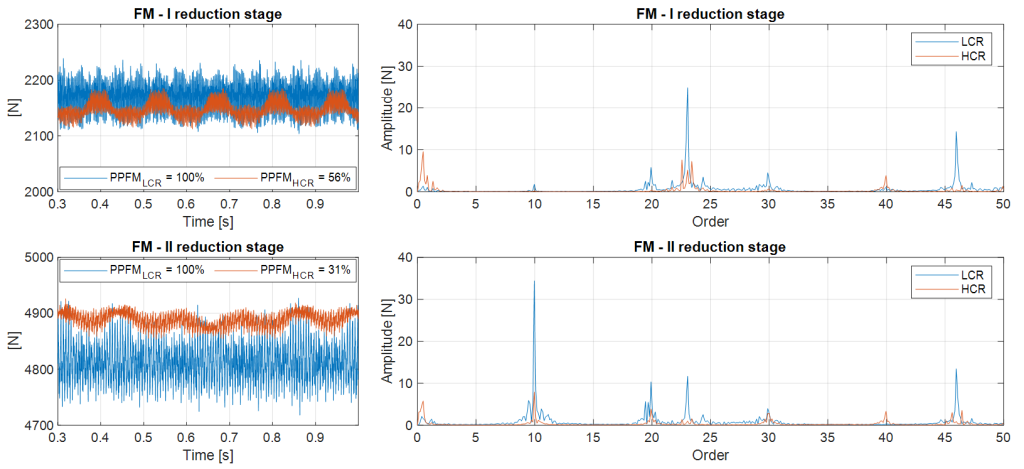- Loads on Bearings: comparison of the spectra of forces acting on bearings (figure 6) indicates that the HCR configuration results in lower loads, contributing to higher reliability and lower mechanical stresses.