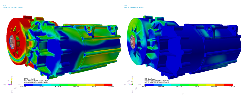 - (ERP): ERP maps (figure 7) clearly highlight that the critical regions of the housing are less subjected to an intense sound radiation in the HCR configuration, suggesting possible targeted interventions such as local stiffening through the application of ribs.